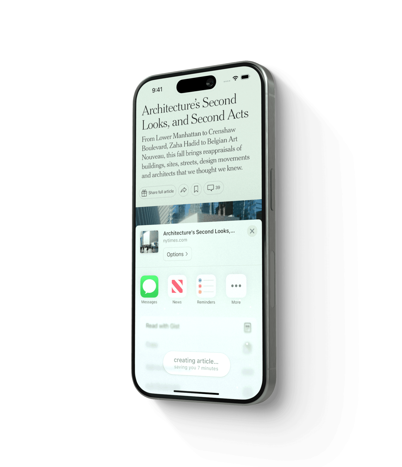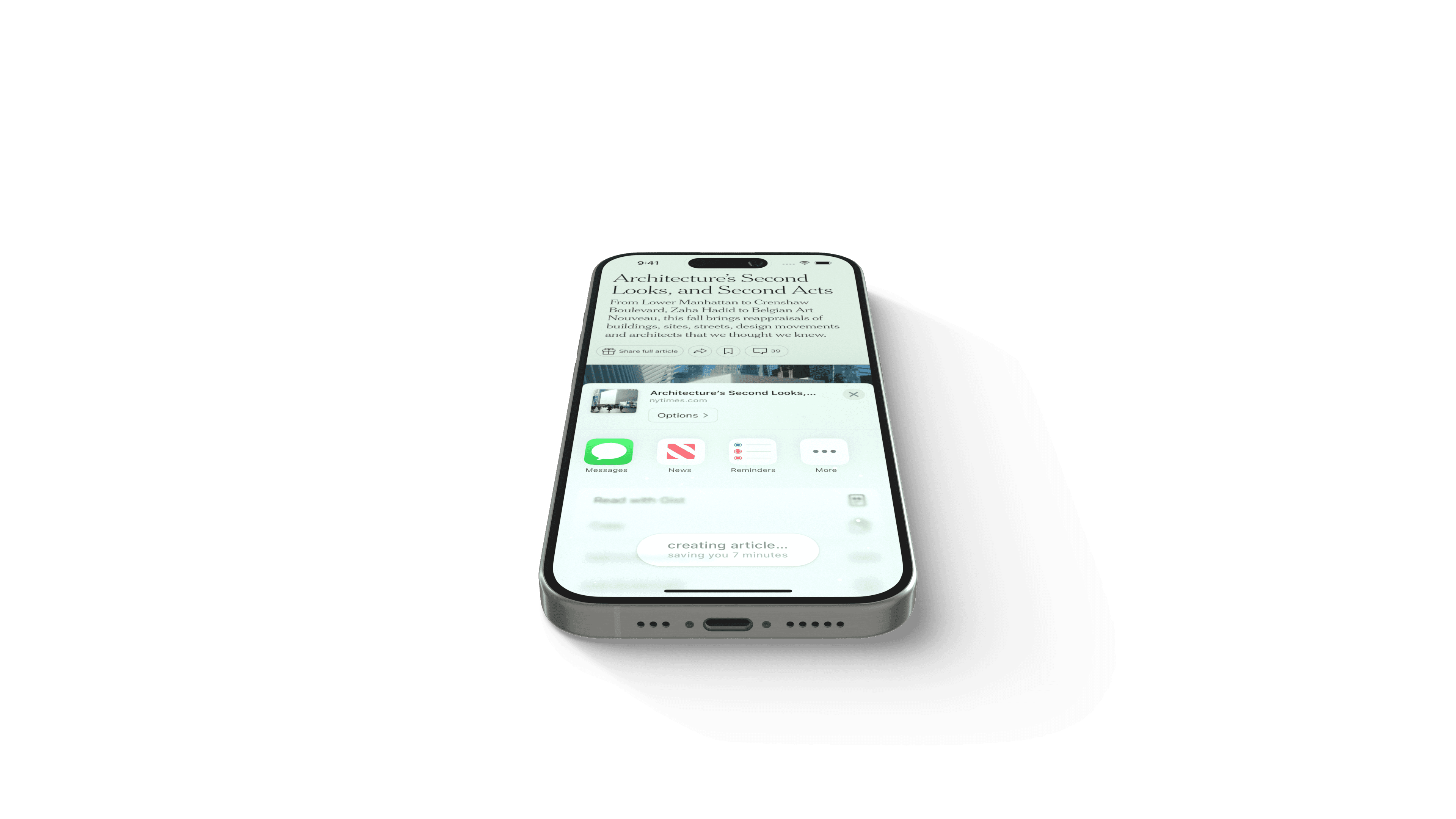 With a single tap, magically condense thousands of words into just a few hundred, keeping only the parts that matter. Gist articles retain the structure and writing style of the source. They sound just like the original piece. It's like the author wrote a whole new, much shorter article, just for you.